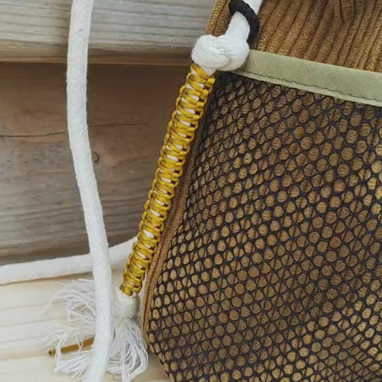Un sac au format compact et au caractère affirmé, mêlant cordons entrelacés et jeux de matières